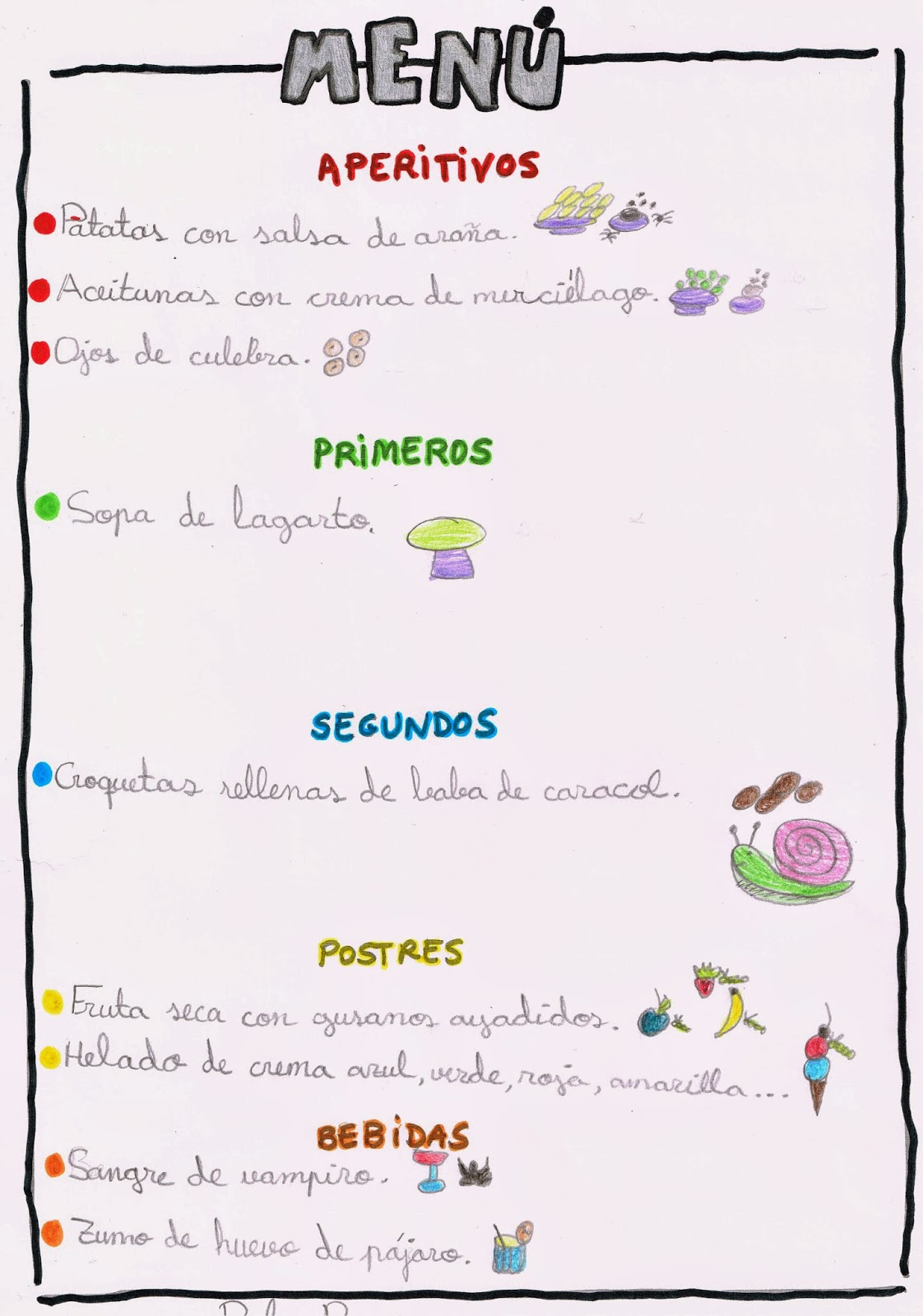 Recientemente hemos trabajado en clase un "menú para monstruos" muy divertido. Los niños y las niñas han aprendido algunos conceptos que desconocían, por ejemplo, qué son los aperitivos, los entrantes, cómo es la carta de un restaurante, y a continuación, han elaborado su propio menú.